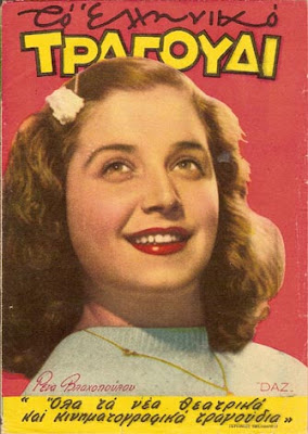 Το παλιότερο εξώφυλλο περιοδικού με τη μορφή της Ρένας Βλαχοπούλου που έχω εντοπίσει δημοσιεύτηκε τον Ιανουάριο του 1943: το Ράδιο-Τραγούδι όμως δεν παρουσιάζει φωτογραφία της, αλλά σκίτσο της (το είχα παρουσιάσει πρόπερσι, στο αφιέρωμα στα έντεκα χρόνια από το φευγιό της). Στα χρόνια της Κατοχής κυκλοφόρησαν πολύ λίγα περιοδικά με φωτογραφίες καλλιτεχνών στα εξώφυλλά τους (αντίθετα, υπήρχαν συχνά φωτογραφίες, και της Ρένας Βλαχοπούλου, στα εξώφυλλα "μουσικών τεμαχίων" με τις επιτυχίες του ελαφρού τραγουδιού της εποχής). Έτσι, το πρώτο εξώφυλλο με φωτογραφία της Ρένας Βλαχοπούλου φαίνεται πως δημοσιεύτηκε τον Αύγουστο του 1944: το περιοδικό Το ελληνικό τραγούδι (κρίκος της μακράς αλυσίδας περιοδικών που δημοσίευαν στίχους τραγουδιών από τον Μεσοπόλεμο μέχρι τη δεκαετία του '60) παρουσιάζει μια φωτογραφία της Ρένας που θα χρησιμοποιηθεί αργότερα σε ένα ακόμα εξώφυλλο μετά την Απελευθέρωση (στο μάλλον βραχύβιο περιοδικό Η Αθήνα τραγουδά). Προς το παρόν όμως βρισκόμαστε στο πιο ζοφερό καλοκαίρι της Κατοχής: περίοδος άγριου πληθωρισμού και ανακατατάξεων, με τους Γερμανούς να δείχνουν το πιο άγριο πρόσωπό τους λίγο πριν φύγουν από την Ελλάδα και την Αντίσταση να έχει φουντώσει. Η Ρένα Βλαχοπούλου ανήκει στον θίασο του Πέτρου Κυριακού που εκείνο τον μήνα ανεβάζει στο θέατρο Ερμής (το σημερινό θέατρο Βέμπο) την επιθεώρηση Γαλανομάτα και τη μουσική ηθογραφία Η καρδιά του ναύτη. Σ' αυτό το έργο, την Κυριακή 28 Αυγούστου 1944, η Ρένα Βλαχοπούλου ενθουσιάζει τόσο πολύ με το τραγούδι της το κοινό που στη δεύτερη πράξη την αναγκάζει να μείνει στη σκηνή επί είκοσι λεπτά και να πει από δύο φορές τρία τραγούδια...